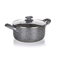 Garnek z tłoczonego aluminium, z nieprzywierającą 2-warstwową powierzchnią w granitowym dekorze, praktyczny pomocnik w każdej kucharki. W komplecie z szarymi silikonowymi uchwytami, szklaną pokrywą z szarym silikonowym uchwytem. Posiada w pełni indukcyjne dno. Grubość ścian i dna: 2,5 mm